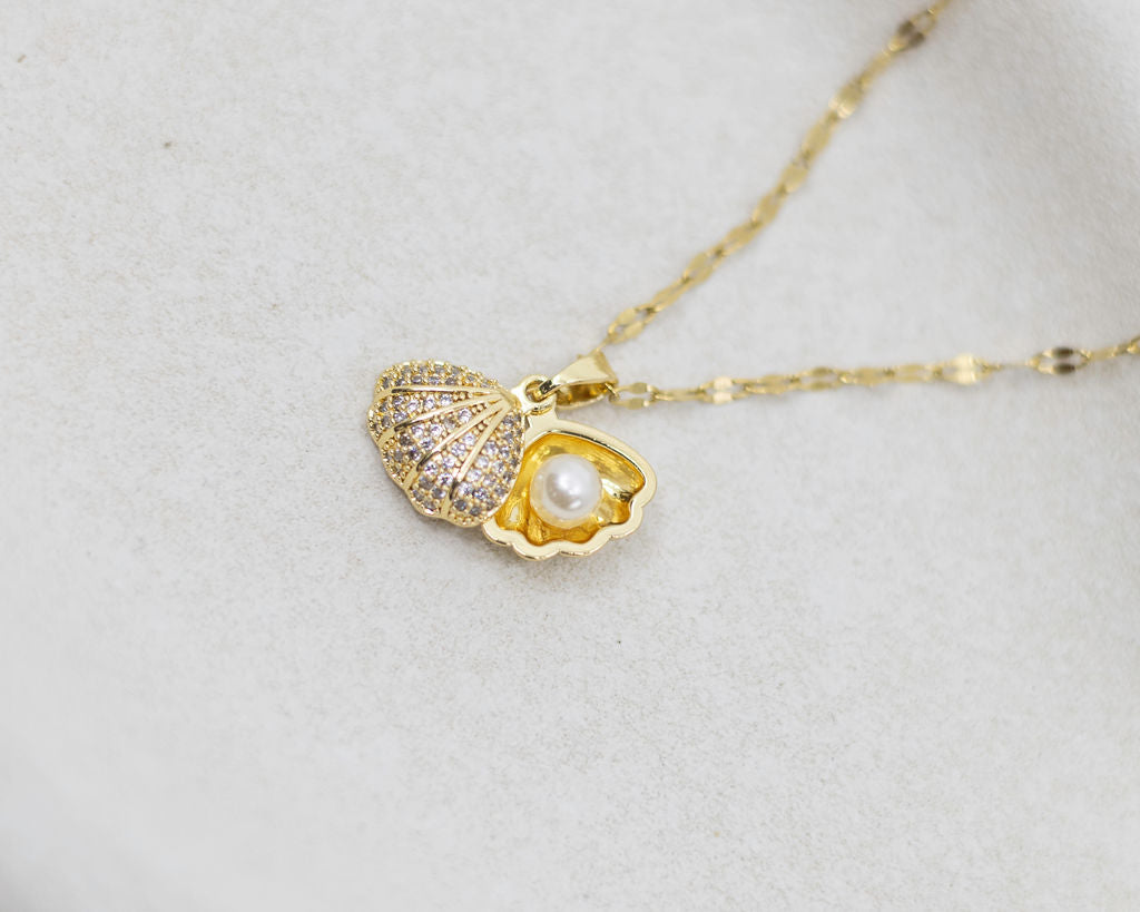 Charlotte features a finely detailed opening clam shell design - one half sparkles with delicate cubic zirconias while the other reveals a luminous pearl nestled inside, a symbol of hidden beauty and ocean treasures.